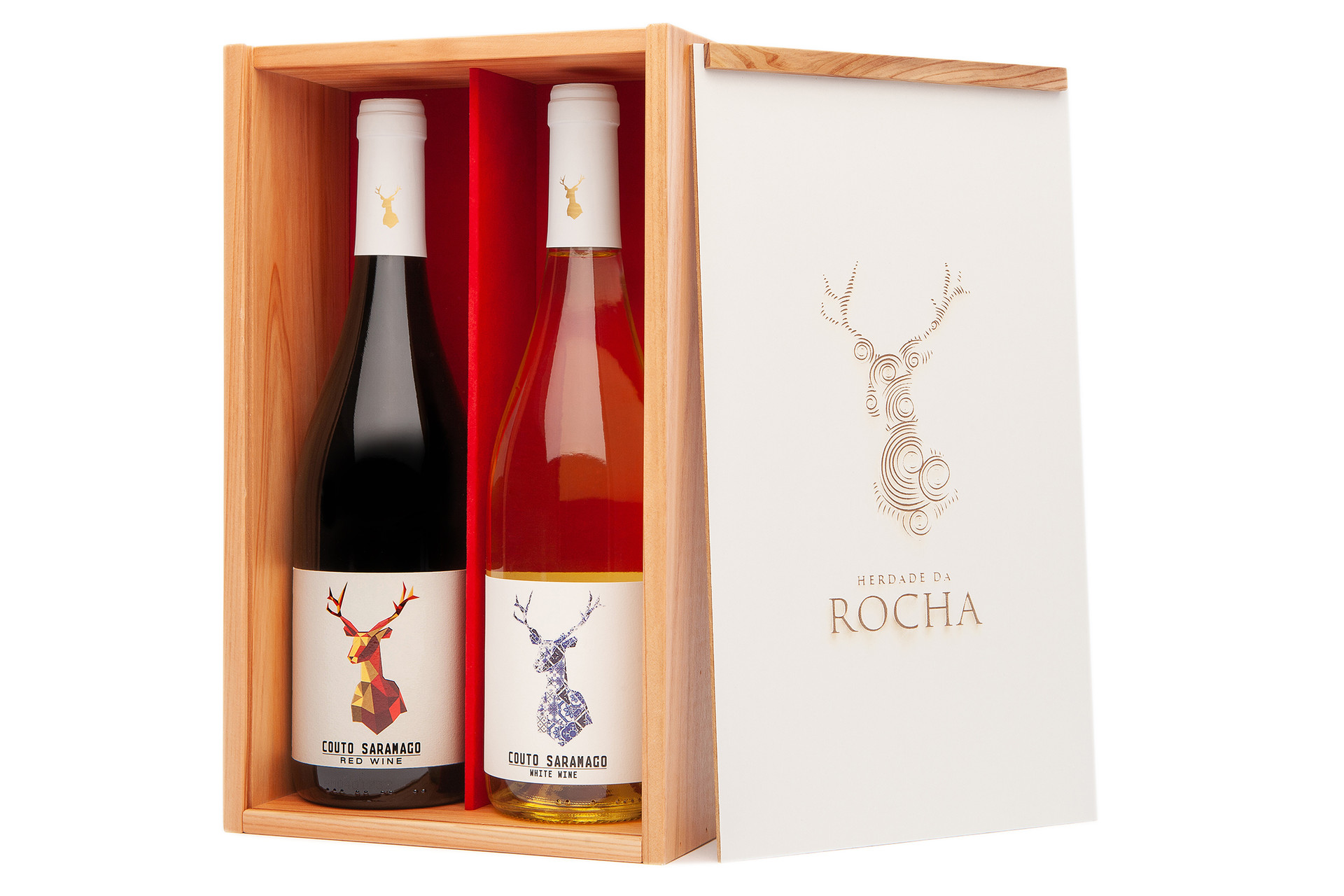 Wooden box with: 2 x Red Wine 2015 78% Alicante Bouschet, 10% Touriga Franca, 6% Touriga Nacional e 6% Syrah 13.5% Vol. 750ml