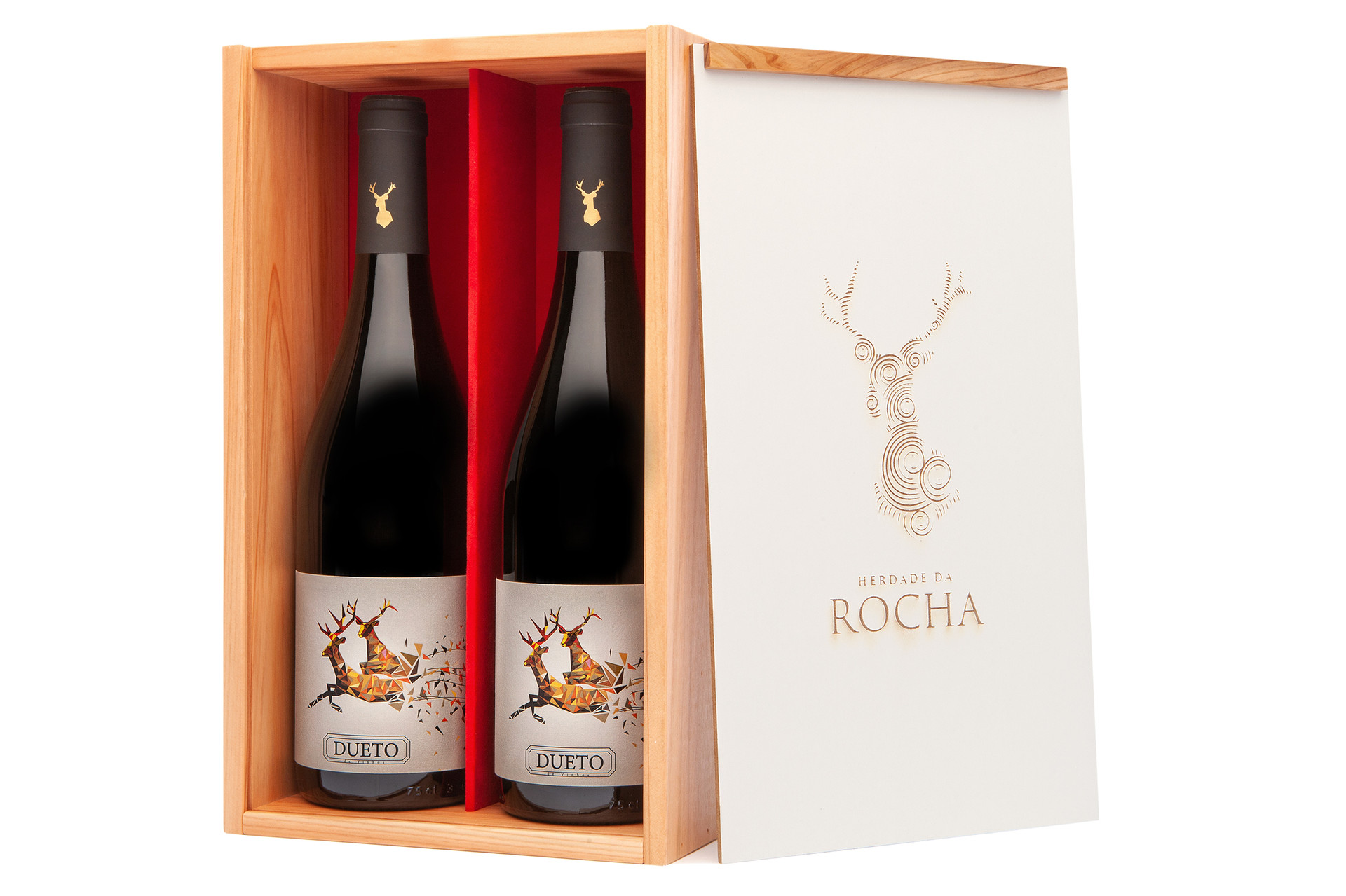 Wooden box with: 1 x Selection 2015 41% Syrah, 38% Alicante Bouschet e 21%Touriga Nacional 14% Vol 1 x Red Wine 2015 78% Alicante Bouschet, 10% Touriga Franca, 6% Touriga Nacional e 6% Syrah 13.5% Vol.